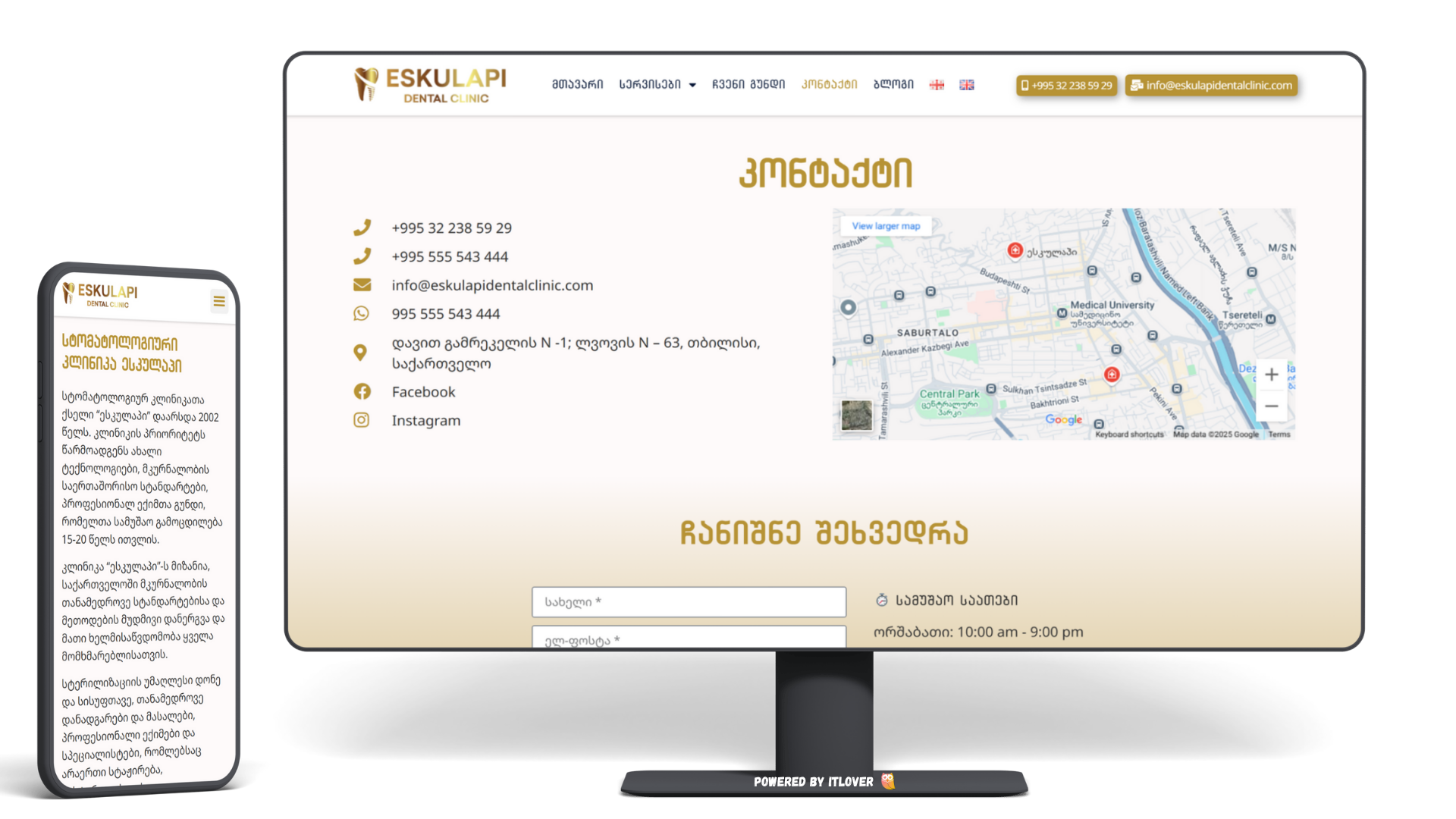 სტომატოლოგიური კლინიკა Eskulapi-სთვის მობილურზე ოპტიმიზირებული და თანამედროვე კორპორატიული საიტის დამზადება, რომელიც მოიცავს მომსახურების აღწერას, ექიმების ბიოგრაფიებსა და ონლაინ შეხვედრის ჩანიშვნის ფორმას.